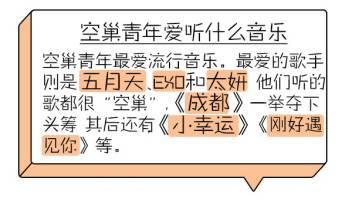 “空巢青年”不仅爱分享,更有着自己的喜爱偏好,这一点从听歌偏好上就可见一斑。五月天是“空巢青年”最常听的国内歌手,陈奕迅、林宥嘉、田馥甄紧随其后。在国外歌手表现方面,韩国男团EXO成为“空巢青年”最爱的外国爱豆,一举横扫“霉霉”泰勒·斯威夫特与阿黛尔。