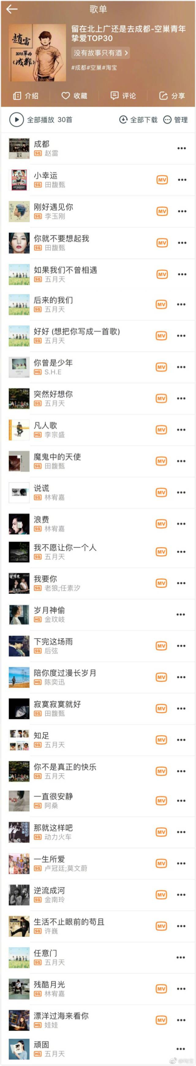 看着下面的空巢青年歌单top30,是不是都想跟着唱起来了呢