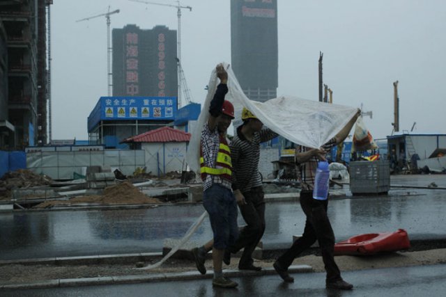 由于大雨持续,为了确保施工安全,刚刚上班的工人们被临时通知放假休息。就这样,原本是用来遮盖杂料的塑料、纸盒、木板等物品被临时改制成了雨伞、雨衣用来躲避这场大雨,大家都各想招数,尽量避免在回到宿舍前衣服被大雨浇湿。