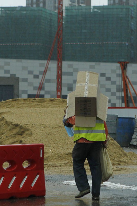 一场突然而来的大雨,让深圳林立的高楼瞬间有了另外一种意境,耸立的高楼在云层里忽隐忽现,瞬息万变的风景是一种绝对的视觉震撼。在身后笼罩在大雾中的高楼衬托下,这些身披自制简易雨衣的工人们就像是一个个跳动的音符,用自己的辛勤劳动,谱写着城市建设的辉煌乐章。