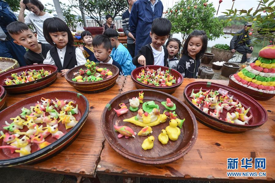 5月4日,丁山河村的孩子们学习做米塑“立夏狗”。临近立夏(5月5日),浙江省杭州市余杭区塘栖古镇丁山河村的村民们举行了一场“民俗迎立夏”活动。成群结队的儿童走村串户,挨家挨户“派野米”(每家每户要米),在河边地头搭土灶,生野火,烧野米饭(又称乌米饭)。民间美食艺人和孩子一起现场用米塑做“立夏狗”,腌灰鸭蛋(咸鸭蛋),寓意吃了立夏狗,小孩身体健壮顺利成长;吃了野米饭,将来走四方成大业。新华社记者徐昱 摄