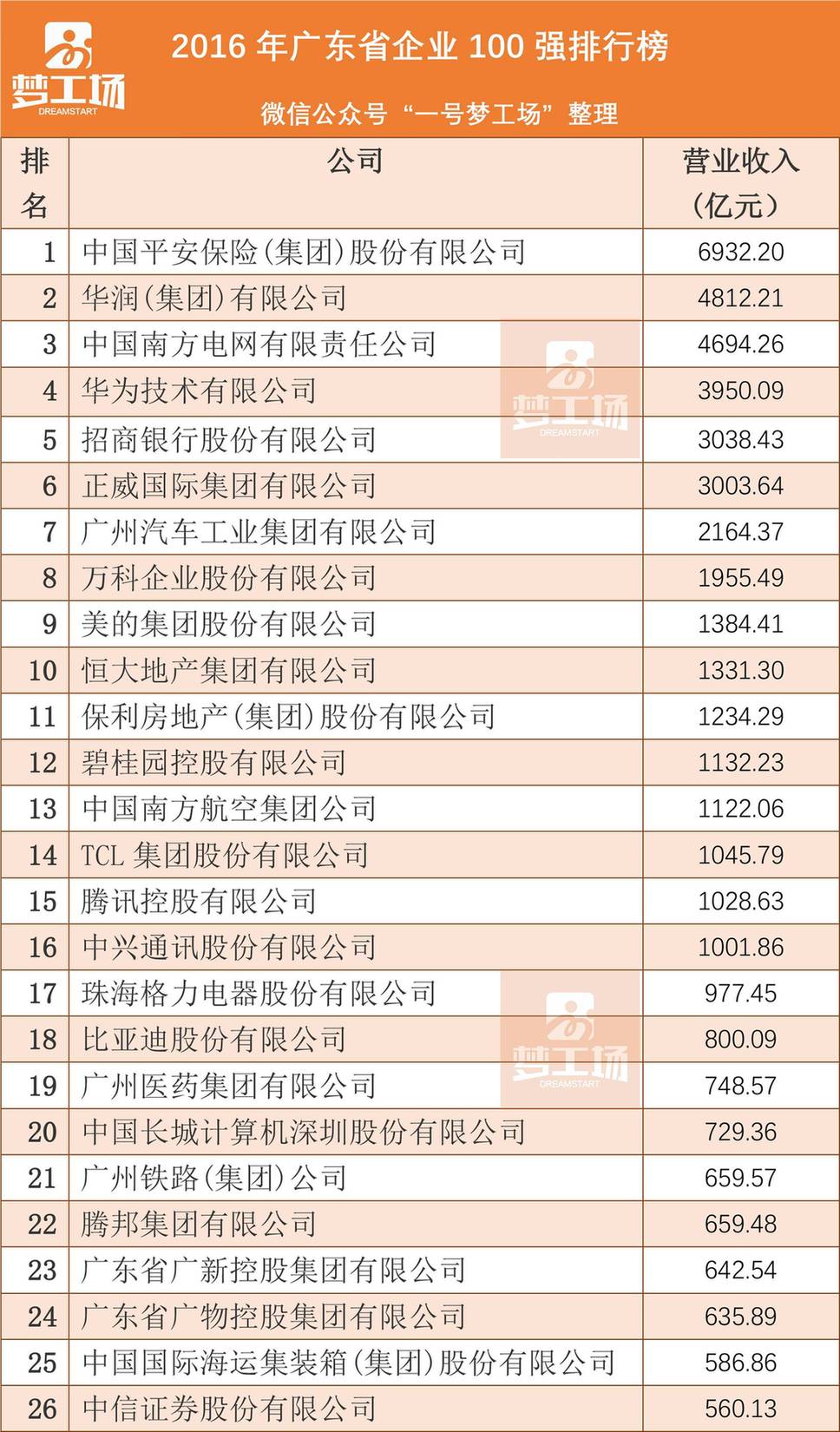 由广东省企业联合会、广东省企业家协会联合发布的“2016年广东省企业100强排行榜”显示,根据 企业营收金额进行排名,2016年广东企业前十位大佬依次是中国平安、华润集团、南方电网、华为、招商银行、正威国际、广汽集团、万科、美的、恒大。