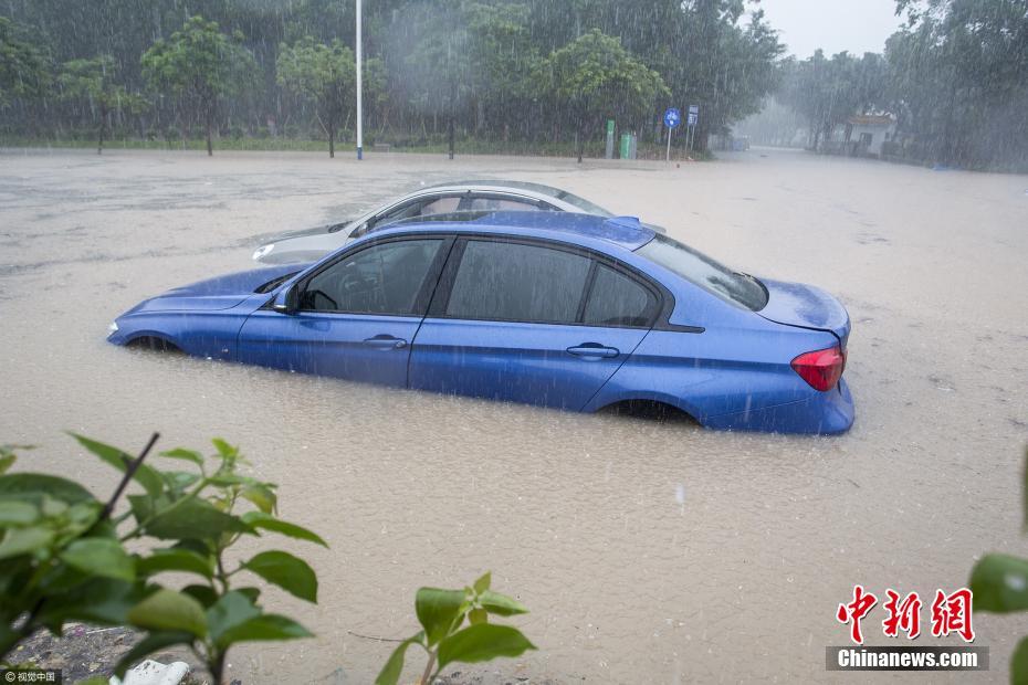 2017年5月7日中午,广州番禺区里仁洞跨线桥下道路因暴雨积水水位迅速上升,有十多部小汽车来不及通过被困水中,整条道路交通一度中断。图片来源:视觉中国
