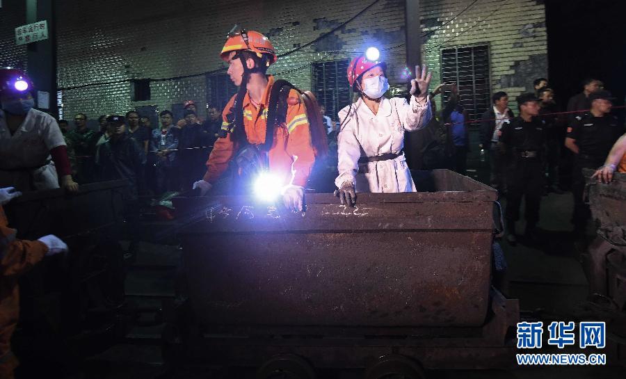 5月8日凌晨1时左右,一名下井救援的医务人员升井后向井口工作人员做出手势,示意救出了三名被困人员。新华社记者 李尕摄