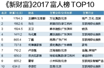《新财富》2017富人榜出炉,王健林稳居首位马云第二。
