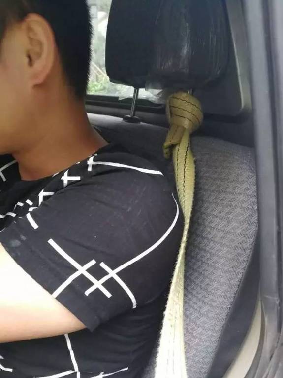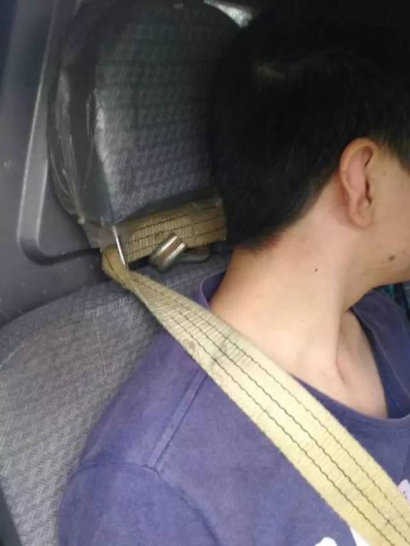 仔细一看,原来他们身上的“安全带”竟然只是一根普通的绳子,系在座椅的上下两侧,乍一看还真和普通安全带没有区别。这条自制的安全带显然没有标准安全带所具备的作用,在意外来临时没有办法很好保护司机。