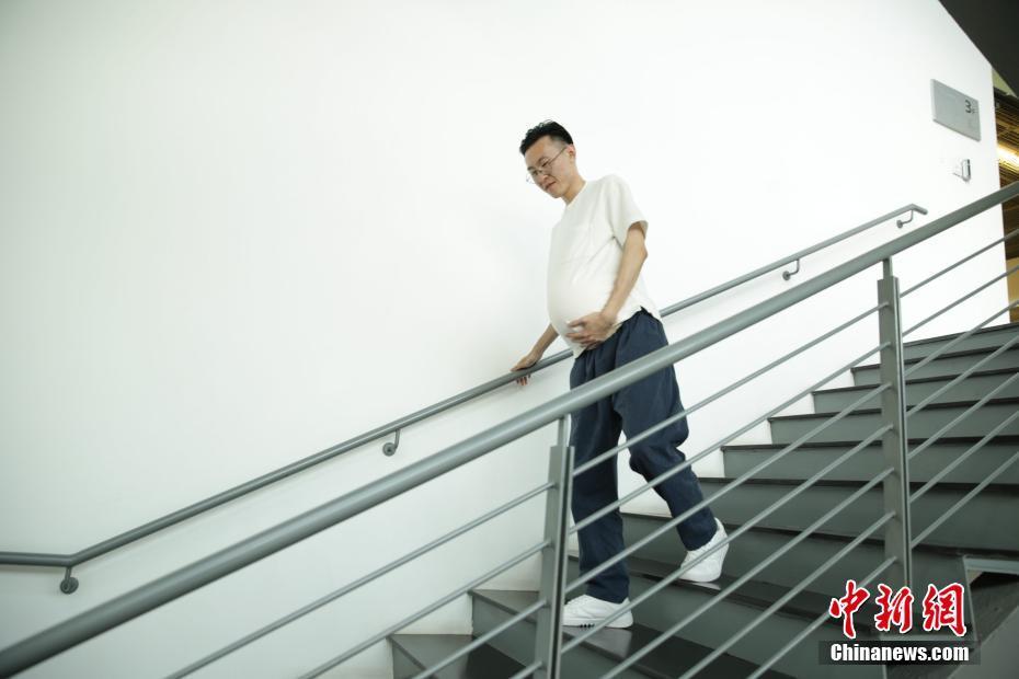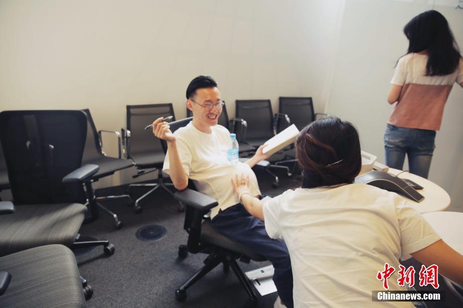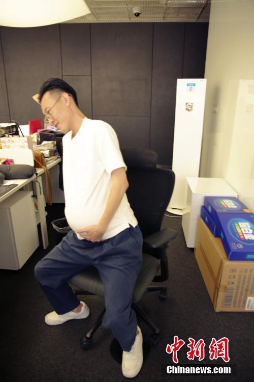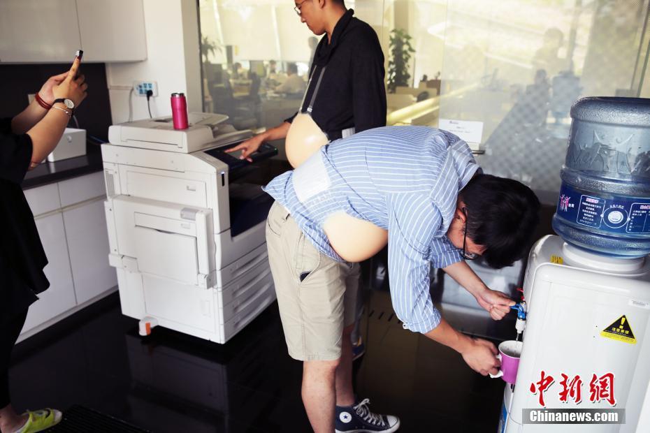 5月11日,母亲节前夕,来自四川泸州的一位小伙子罗某想体验下自己母亲和老婆的不容易,发起“带球上班一周”的活动。罗某带头每天上班前都带上一个模拟孕期的假肚子,并持续一周,虽然穿上这个并不能体验到孕妇的四肢水肿、情绪波动,但是也能感受一些孕妇的“10月之苦”。钟欣摄