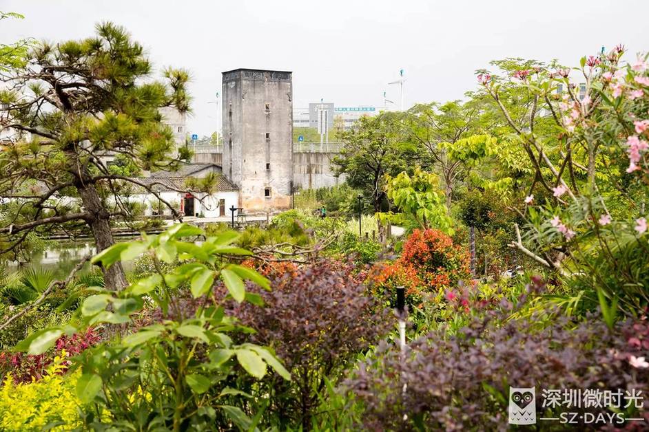 传统的客家围屋在花园般的前景衬托下