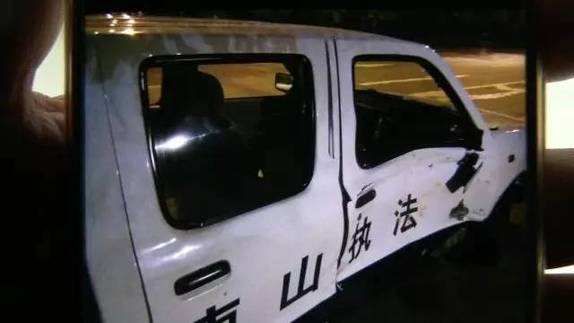 ▲连遭两次撞击,执法车车门严重凹陷,车辆严重变形。