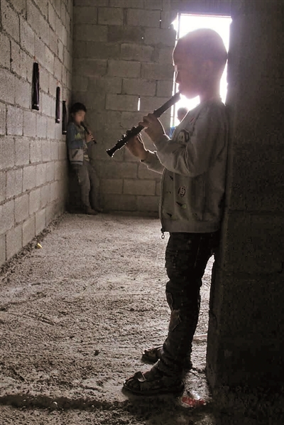 2015年,龚乐在贵州毕节进行音乐支教时,在听完课后,两个小男孩正专心致志地练习长笛。龚乐供图