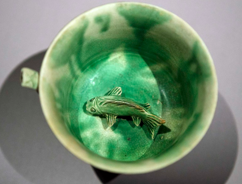从“黑石号”沉船上打捞起的白釉绿彩鱼底吸杯。新华网 邹峥摄