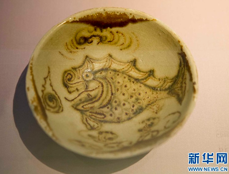 从“黑石号”沉船上打捞起的青釉褐绿彩摩羯纹瓷碗。新华网 邹峥摄