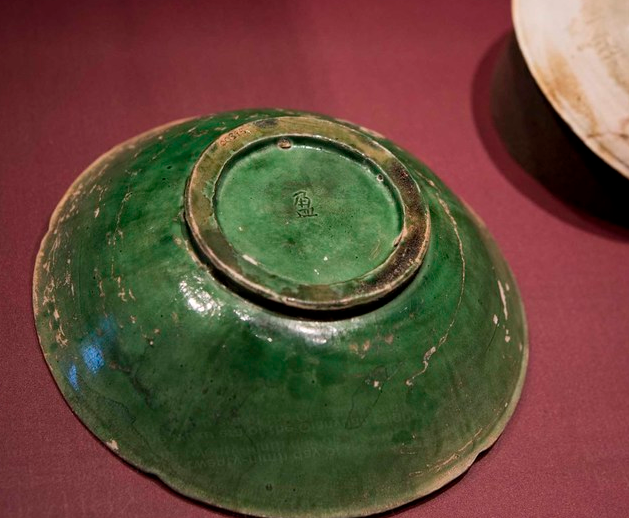 从“黑石号”沉船上打捞起的白釉绿彩龙纹盘。新华网 邹峥摄