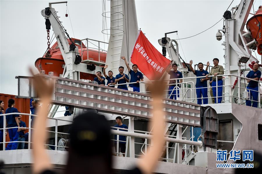 5月16日,“向阳红09”船起航,船上的科考队员向送行的人们挥手告别。当日,中国大洋38航次第三航段从深圳起航,前往雅浦海沟和马里亚纳海沟进行科学考察。新华社记者毛思倩摄