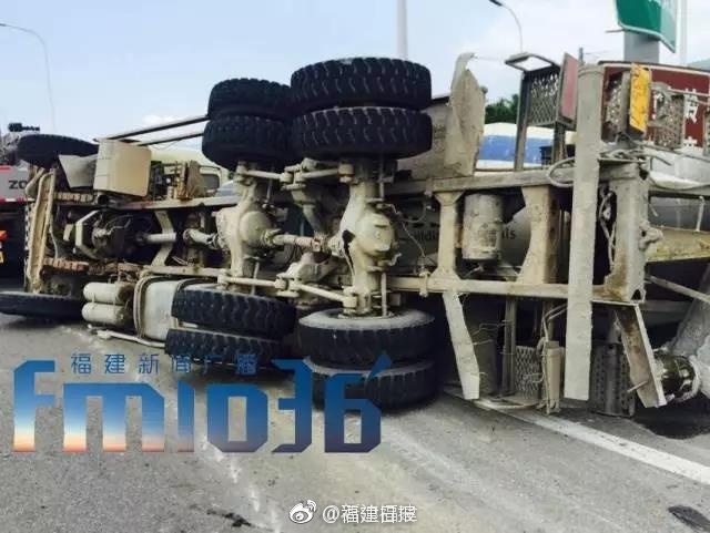 福州三环一水泥罐车侧翻 警车瞬间被压扁