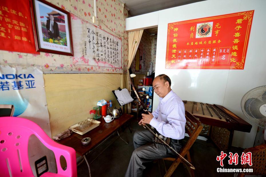 风水师拉上二胡迎客。 王东明 摄