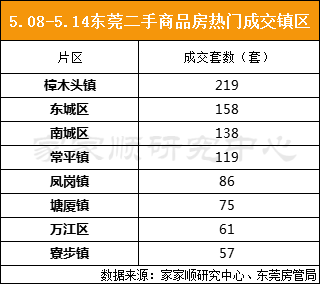 上周各镇区二手商品房成交量中,樟木头镇以219套蝉联第一,临深与中心城区各占三席,前八名中凤岗镇以环比46%排增幅第一。