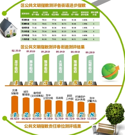 而由龙华区委宣传部(文明办)委托第三方机构对各街道开展的2017年第一季度区公共文明指数测评,全区得分为81.22分。各街道公共文明指数得分,龙华街道以82.35分排首位;第二名是民治街道,得分为81.85分;第三名是观湖街道,得分为81.26分;第四名和第五名分别是大浪街道80.91分、观澜街道80.66分,福城街道以80.28分居末位。