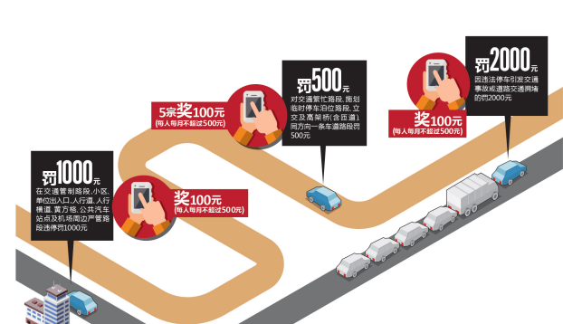 市交警局昨宣布将举报违停纳入有奖举报项目 举报人每月奖金1000元封顶