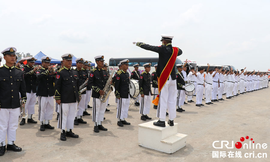 缅甸海军奏乐并向中国军舰挥手告别(洪荃诠 摄)