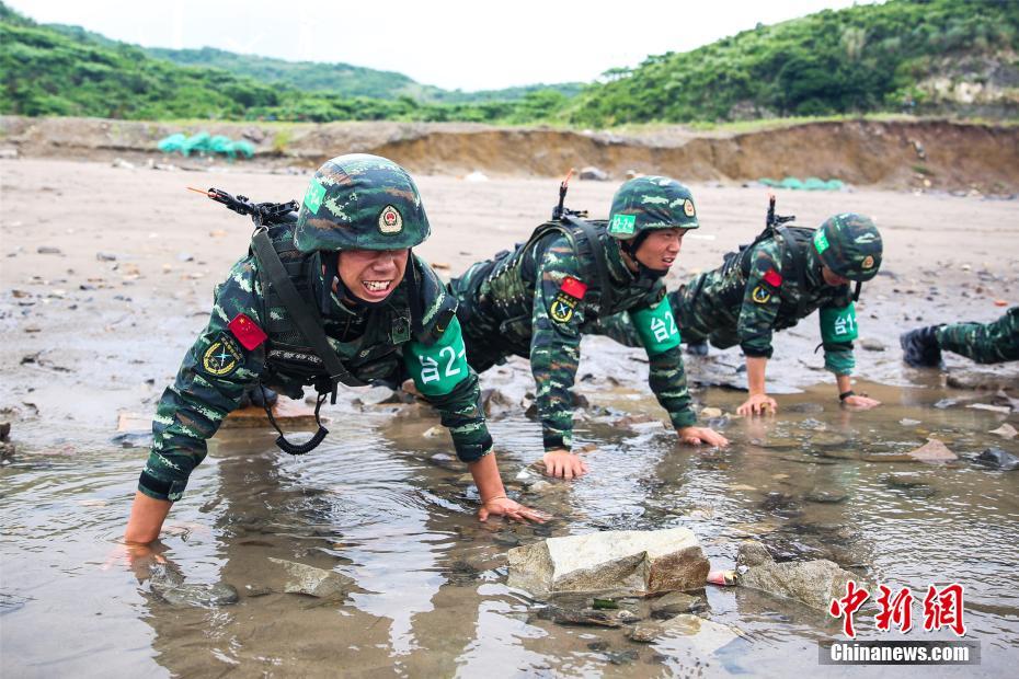 5月24日,特战队员在滩涂上开展体能训练。当天,武警浙江总队组织直属、舟山、宁波、台州等四个支队特勤分队在舟山开展第二季度“魔鬼周”极限训练。据悉,此次“魔鬼周”训练设置了武装奔袭、山地越野、荒岛求生、夜间行军和各种枪械射击等课目。中新社记者张晓庆 摄