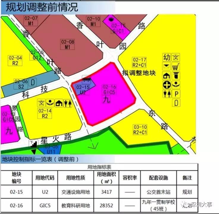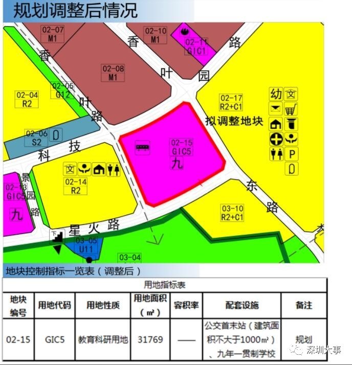 (一)地块合并。拟将[石芽岭地区]法定图则(报签版)02-15地块和02-16地块合并。调整后,地块编号为02-15,用地性质为教育科研用地(GIC5),用地面积为31769平方米,配套设施为公交首末站(建筑面积不大于1000平方米)、九年一贯制学校,备注为规划。
