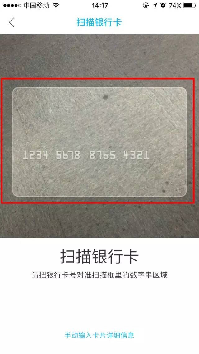 把银行卡号对准扫描框里的数字串区域,扫描银行卡(目前仅支持招商银行储蓄卡哦)。