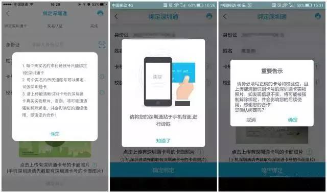 绑定深圳通卡时,NFC手机可以通过读取功能直接识别深圳通卡号,上传清晰的有深圳通卡号的卡面照片即可完成绑定。未实名的市民通账户只能绑定一张深圳通卡,实名过后的市民通账户可以绑定10张深圳通卡。