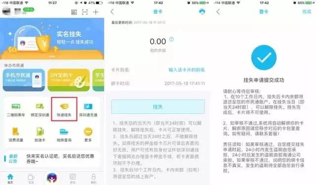 根据页面提示输入个人信息,点击获取验证码并输入后即可完成实名认证。当绑定的深圳通卡丢失时,点击快速挂失,选择丢失的卡片,输入支付密码后即可挂失,挂失后10个工作日内,卡内余额将退回相应的市民通账户。