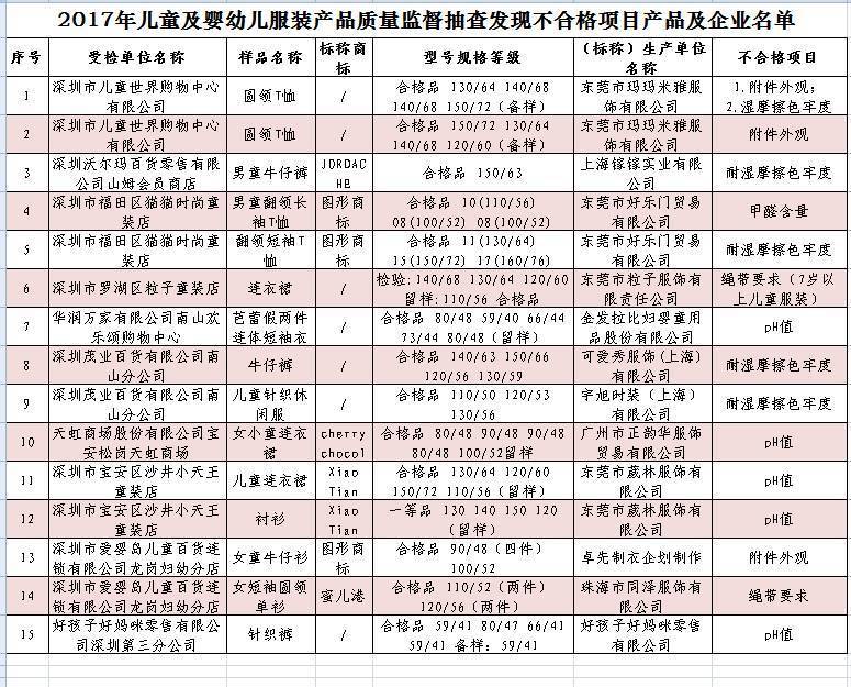 2017年3月,深圳市市场监管局组织开展了儿童及婴幼儿服装产品质量监督抽查。抽查对象为深圳市生产和流通领域的52家受检单位;抽检样品共130批次, 合格产品115批次,不合格产品15批次。针对抽查中发现的产品质量问题,深圳市市场和质量监管局已经依据相关法律法规的规定对不合格产品生产企业、经营者予以处理。现深圳市市场和质量监管局根据《深圳经济特区产品质量管理条例》的规定,决定对本次监督抽查结果进行公布。