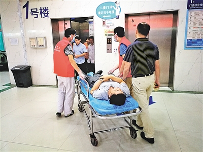 服务过程中,不断有病人或家属过来咨询,志愿者们忙着指路带路、帮忙挂号、测量体温、安慰家属……20时08分,陆顺发大步跑出大厅,门外有救护车到了,一个建筑工人头部受伤被送到医院。陆顺发等志愿者和医护人员一起将病人从车上抬下来,推往急诊室。伤员需要止血,缝合伤口,做CT……看到医生、护士忙不过来时,陆顺发等志愿者就上去搭一把手。