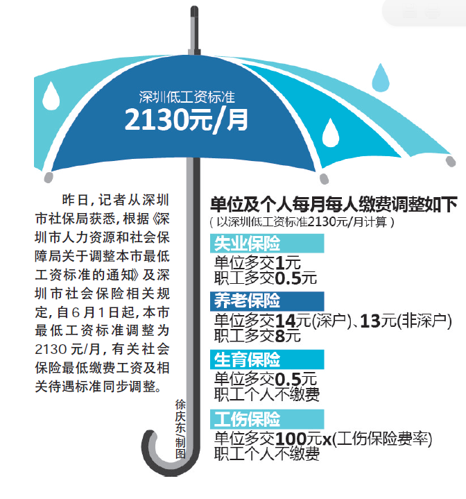 昨日,记者从深圳市社保局获悉,根据《深圳市人力资源和社会保障局关于调整本市最低工资标准的通知》及深圳市社会保险相关规定,自6月1日起,本市最低工资标准调整为2130元/月,有关社会保险最低缴费工资及相关待遇标准同步调整。