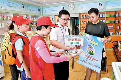 “你好,公共场所不能吸烟,请你熄掉烟”“禁烟场所的经营者和管理者有责任在入口和明显位置设置禁止吸烟标识”……控烟宣传督察员不断对目标人群进行劝阻和提示,同时发放控烟资料,号召市民勇敢对二手烟说“不”,引导场所经营者和管理者主动承担宣传、劝阻的社会责任,和商家一起为控烟场所张贴控烟标识。