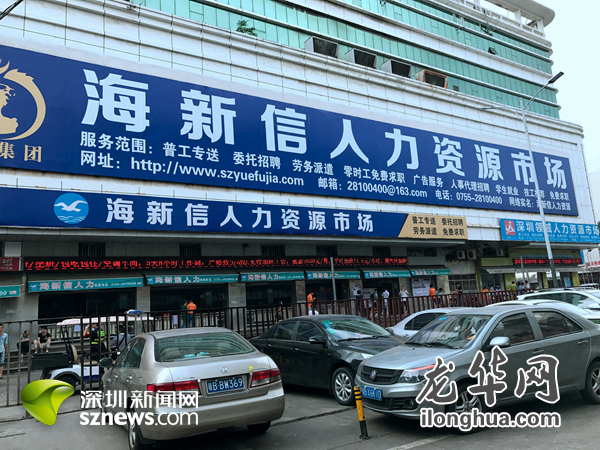 周五下午,记者来到位于龙华区龙华街道景乐北区三和人才市场,站在“旺角休闲城”门口。与想象中的不同,没有人头攒动也没有四处主动凑上来招揽生意的人,几名巡警在市场门口巡逻,抬头便看到LED横屏上滚动显示着“三和人才市场欢迎您”的字样。记者走上二楼的招聘专场,求职的人不是很多,招聘接待处、招聘专栏、应届生服务处等窗口一应俱全,服务人员也都穿着制服。记者了解到,在这里招聘的岗位都需要签正式合同,私人黑中介是不允许进入的。紧接着,记者前往“三和”隔壁的海新信人力资源市场。一块块招聘公布栏立在门口,前来求职的人数不算太多,记者在与一位招工人员李女士交谈中了解到,这里大部分是招聘工厂的员工,月薪大多在3000左右,每天差不多能招到十来个人,大部分都是男性,这样的签约量在这里是比较普遍的。