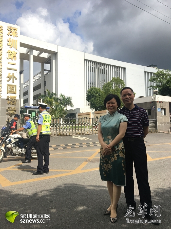 深圳第二外国语学校考点:偷偷陪考的罗氏夫妇。