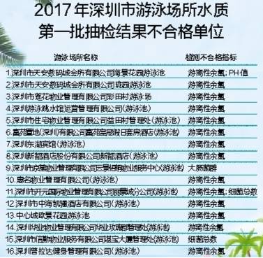 6月7日,深圳市卫计委公布了2017年第一批游泳场所水质抽检结果。本次共抽检游泳场所283家,其中267家合格,深圳市京基物业管理有限公司云景梧桐物业服务中心(游泳池)等16家不合格,不合格率为5.65%。