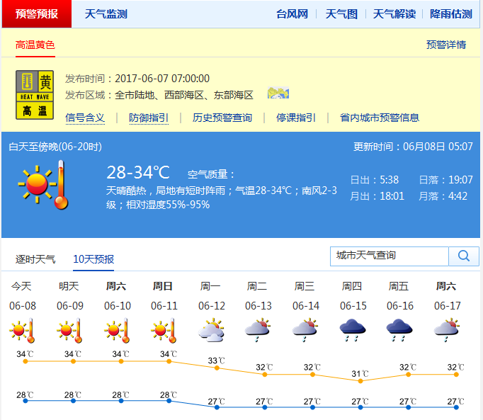 预计8-11日天气持续炎热至酷热,易出现局地短时阵雨或雷阵雨。8日气温27-34℃,中北部和人口密集区最高气温35℃或以上,空气相对湿度60%-95%;12-14日有短时阵雨或雷阵雨。