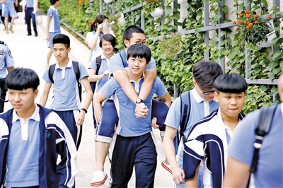 考生廖明轩考试前扭伤脚,在同学们的热心帮助下顺利完成考试。现在,高考的征途已经结束,但同学之间的友情之路很长很长。
