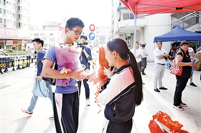 考场外,两名考生收到了爸爸妈妈送上的鲜花。