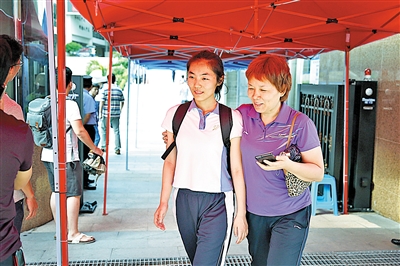家在附近的聂女士下午早早就来到学校门口等儿子。聂女士特地拉了个大箱子,帮小孩一起收拾住校的用品。为了庆祝儿子高考顺利结束,她已经预先买了一台手提电脑,晚上回家给儿子惊喜。她笑着说,“儿子的成绩在学校一直都不错,相信他今天也会考得不错,暑假得好好犒劳他。”