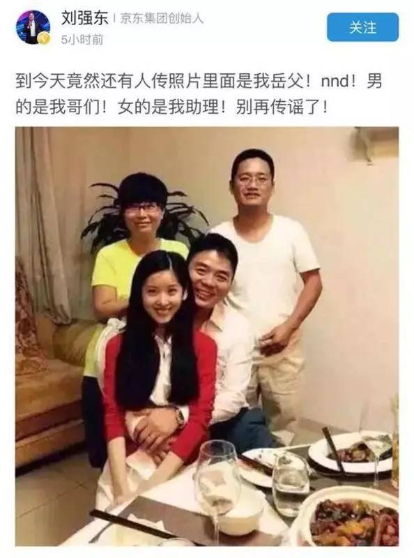 6月8日,京东集团创始人刘强东公开就一张社交媒体中流传的照片做出澄清。刘强东表示,照片中站在他和奶茶后面的不是“岳父母”,是哥们与助理。