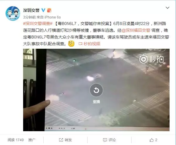 6月8日凌晨4时22分,深圳市福田区新洲路莲花路口的人行横道灯和沙桶等被撞,事故发生之后,肇事司机驾车逃逸。