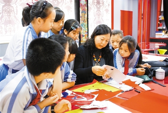 ▲田氏剪纸代表性传承人田星在清湖小学传授剪纸技艺。