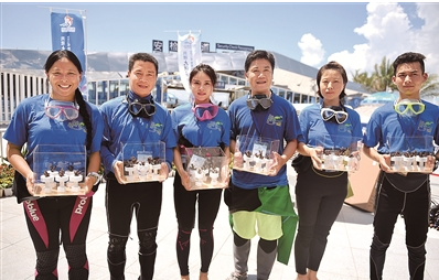 6月8日,在深圳大梅沙海滨公园,志愿者们展示准备出海移植的珊瑚苗。 新华社记者 毛思倩 摄