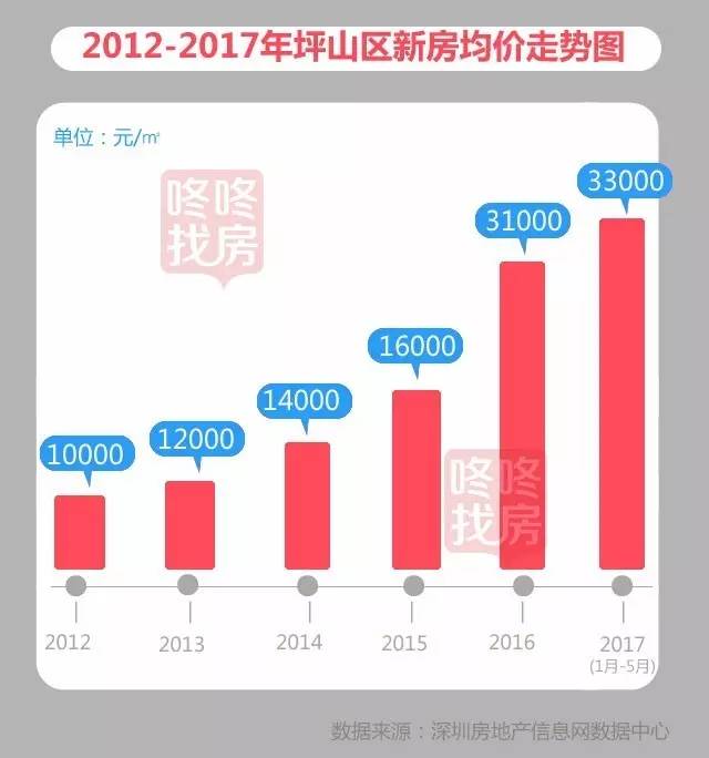 2016年-2017年,受供给限制,坪山区成交量回落,不过房价却大幅提升,坪山区在全市的地位已有了大幅的提升,置业者一改过去偏远差的看法,很多人看好坪山未来的发展,现阶段坪山区在售新盘的价格约在3-4万元,相对于深圳其他区,价格仍比较理性。