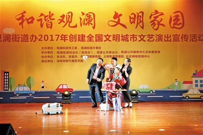 近日,“和谐观澜 文明家园”观澜街道2017年创建全国文明城市文艺演出宣传活动走进观澜中心小学,由专业团队根据观澜城市综合品质提升行动素材专题创作快板、小品、相声等节目,寓教于乐,倡导共建共享和谐文明家园,号召同学们“争做文明小学生”,在校园、在家庭、在公共场所,担当文明小使者的重任。