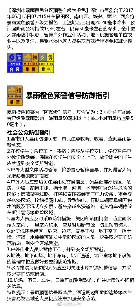 深圳市气象台于2017年06月13日07时15分在福田区、南山区、新安、民治、西乡将暴雨黄色预警升级为橙色,上述地区已出现20-40毫米降水,预计强降雨还将持续1小时左右,仍有30毫米左右的降水,全市进入暴雨防御状态,暂停户外作业和活动。