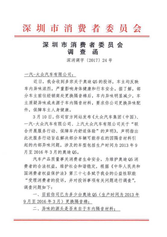 深圳新闻网讯 (记者 许可馨)"深圳市消费者委员会"微信公众号发文《深圳市消委会就奥迪Q5车内异味问题向一汽-大众发出调查函》,全文如下: