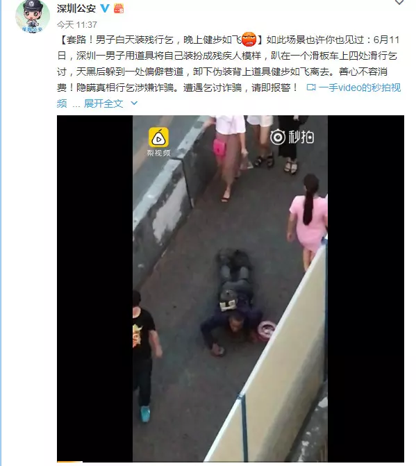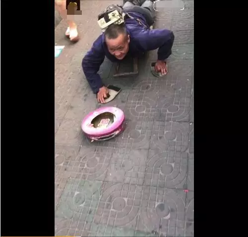 深圳一男子用道具将自己装扮成残疾人模样,趴在一个滑板车上四处滑行乞讨,天黑后躲到一处偏僻巷道,卸下伪装背上道具健步如飞离去。