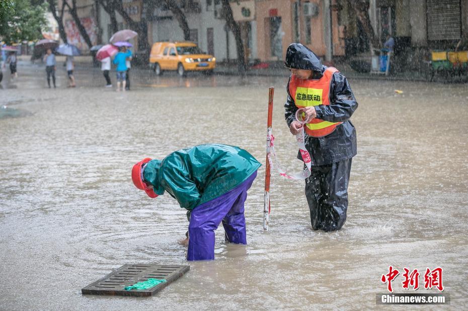 6月13日,浙江省金华市浦江县大雨倾盆,抢险人员冒雨排查隐患。自6月9日入梅以来,该县普降大到暴雨,截至13日16时,累计降雨量已达192.7毫米。中新社发 张浩钺 摄